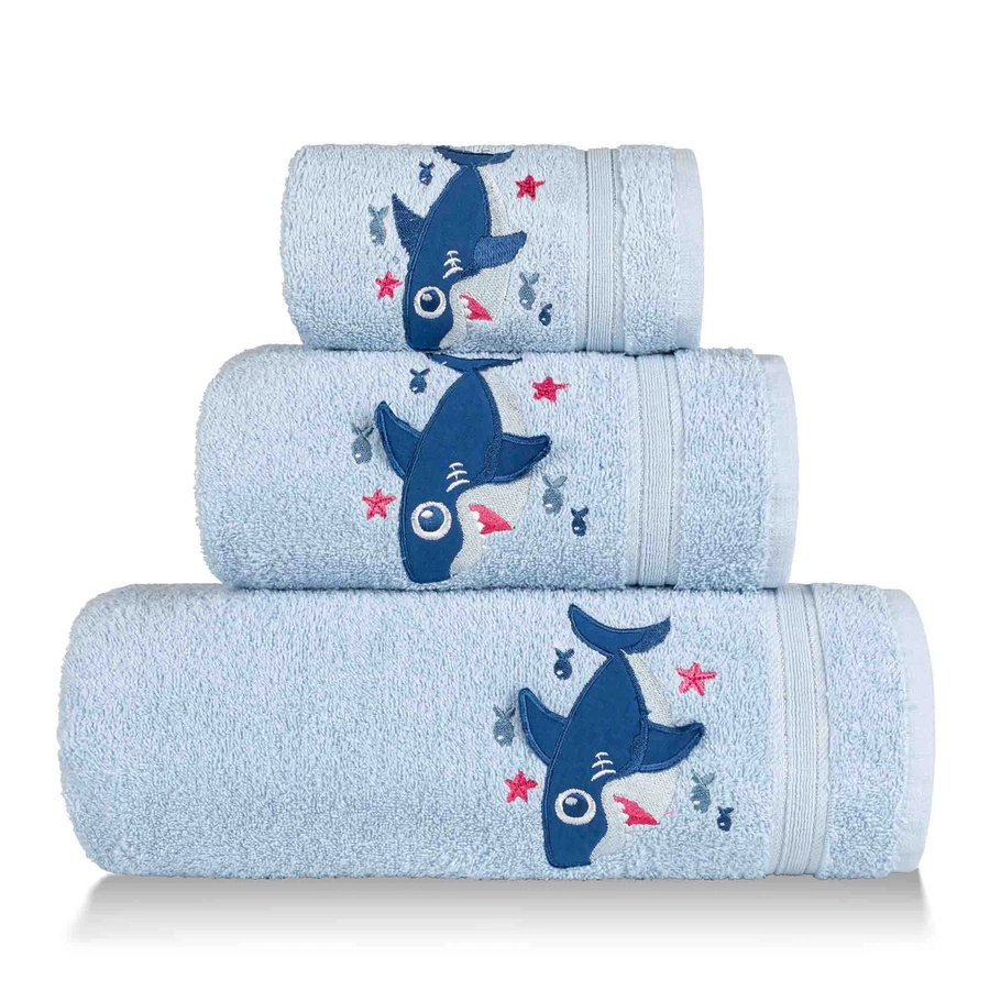 Błękitny gruby ręcznik dziecięcy model rekinek Spod Igły i Nitki – doskonała chłonność