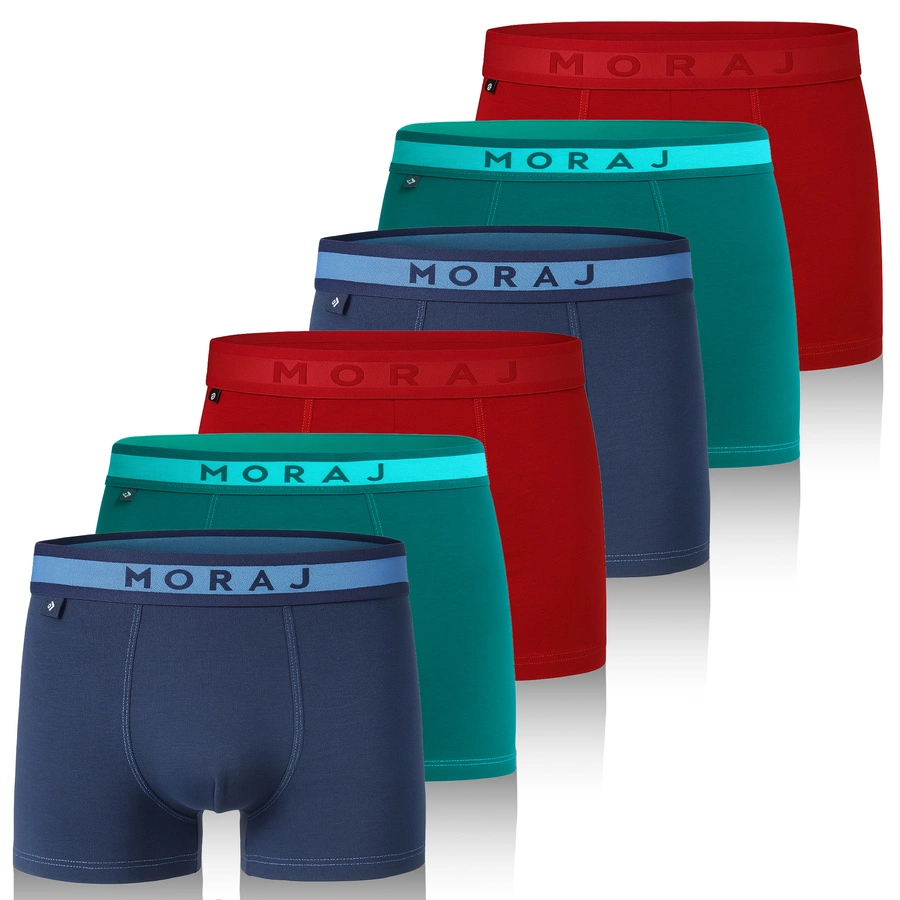 Bokserki męskie Moraj w 6-paku to połączenie klasycznego kroju, wygody i wysokiej jakości materiałów. Wykonane z bawełny z domieszką elastanu, zapewniają doskonałe dopasowanie do sylwetki, przewiewność i komfort noszenia przez cały dzień. Klasyczny fason z krótkimi nogawkami nie krępuje ruchów, a szeroka elastyczna guma w pasie gwarantuje idealne przyleganie bez ucisku. Zestaw obejmuje sześć sztuk w trzech wariantach kolorystycznych: butelkowa zieleń z turkusową gumą, czerwień z bordową gumą oraz granat z niebieską gumą. To praktyczny wybór dla mężczyzn ceniących wygodę i styl na co dzień.