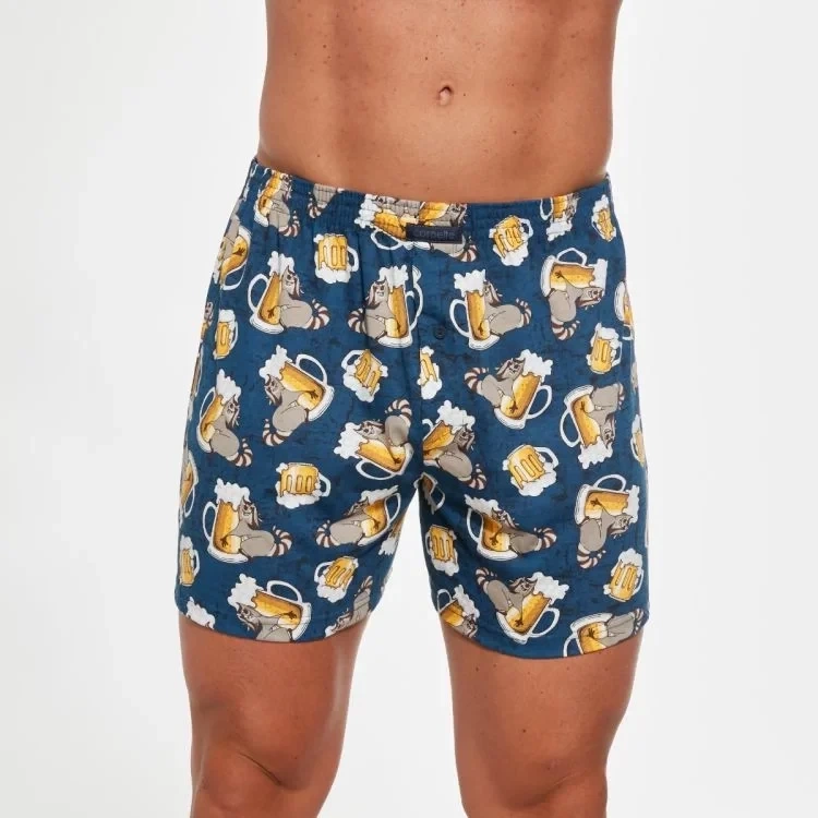 Luźne bokserki męskie ze ekstrawaganckim wzorem zostały wykonane z wysokogatunkowej miękkiej i przyjemnej w dotyku bawełny. Pełną swobodę ruchów zapewnia luźny krój oraz zastosowany materiał. Naturalna dzianina jest niezwykle delikatna dla skórymiła w dotyku, pozwala skórze swobodnie oddychać. Wygodna szeroka guma w pasie jest obszyta miękkim materiałem. Luźne bokserki są idealną propozycją dla mężczyzn ceniących sobie komfortową bieliznę i niebanalne wzornictwo.