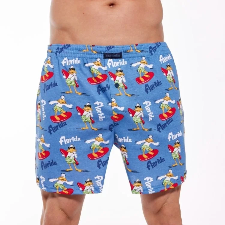 Luźne bokserki męskie ze ekstrawaganckim wzorem zostały wykonane z wysokogatunkowej miękkiej i przyjemnej w dotyku bawełny. Pełną swobodę ruchów zapewnia luźny krój oraz zastosowany materiał. Naturalna dzianina jest niezwykle delikatna dla skóry, miła w dotyku, pozwala skórze swobodnie oddychać. Wygodna szeroka guma w pasie jest obszyta miękkim materiałem. Luźne bokserki są idealną propozycją dla mężczyzn ceniących sobie komfortową bieliznę i niebanalne wzornictwo.