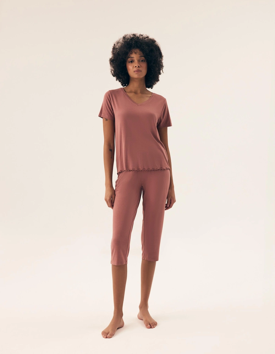 Stylowy krój piżamy w kolorze mauve podkreśla kobiecość, a starannie wykończone szwy zapewniają trwałość i estetykę wykonania. Materiał składa się w 95% z wiskozy oraz w 5% z elastanu, co wpływa na jego delikatność i przyjemność w dotyku.