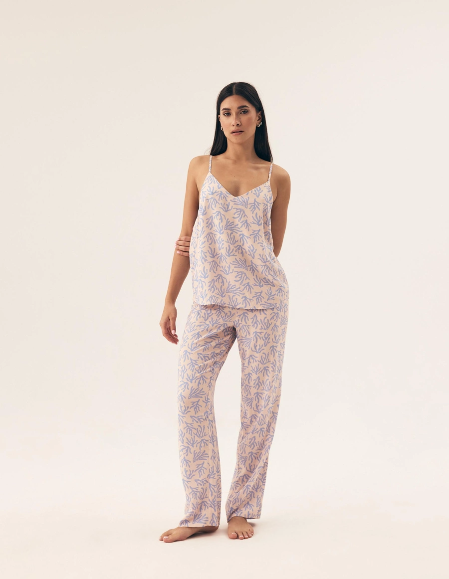 Ta piżama charakteryzuje się doskonałymi właściwościami oddychającymi, zapewniającymi komfortowy sen w każdej sytuacji. Wiskoza, z której uszyto zarówno top, jak i spodnie, gwarantuje niezwykłą miękkość i przewiewność. Doskonale sprawdzi się jako codzienny strój do relaksu w domu, ale również jako elegancka opcja na nocowanie poza domem.