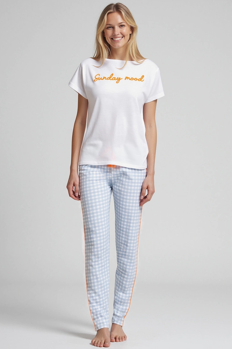 Górna część piżamy to koszulka z krótkim rękawem i okrągłym dekoltem, ozdobiona subtelnym, kontrastowym haftem. To połączenie klasyki z nowoczesnością, które z pewnością przypadnie do gustu każdemu miłośnikowi stylu. Dolna część to długie, proste spodnie w elegancką różowo-białą kratkę, które nie tylko doskonale się prezentują, ale również zapewniają swobodę ruchu. Dzięki gumce w pasie i kolorowemu sznurkowi, spodnie są nie tylko estetyczne, ale także praktyczne i łatwo dopasowują się do każdej sylwetki.
