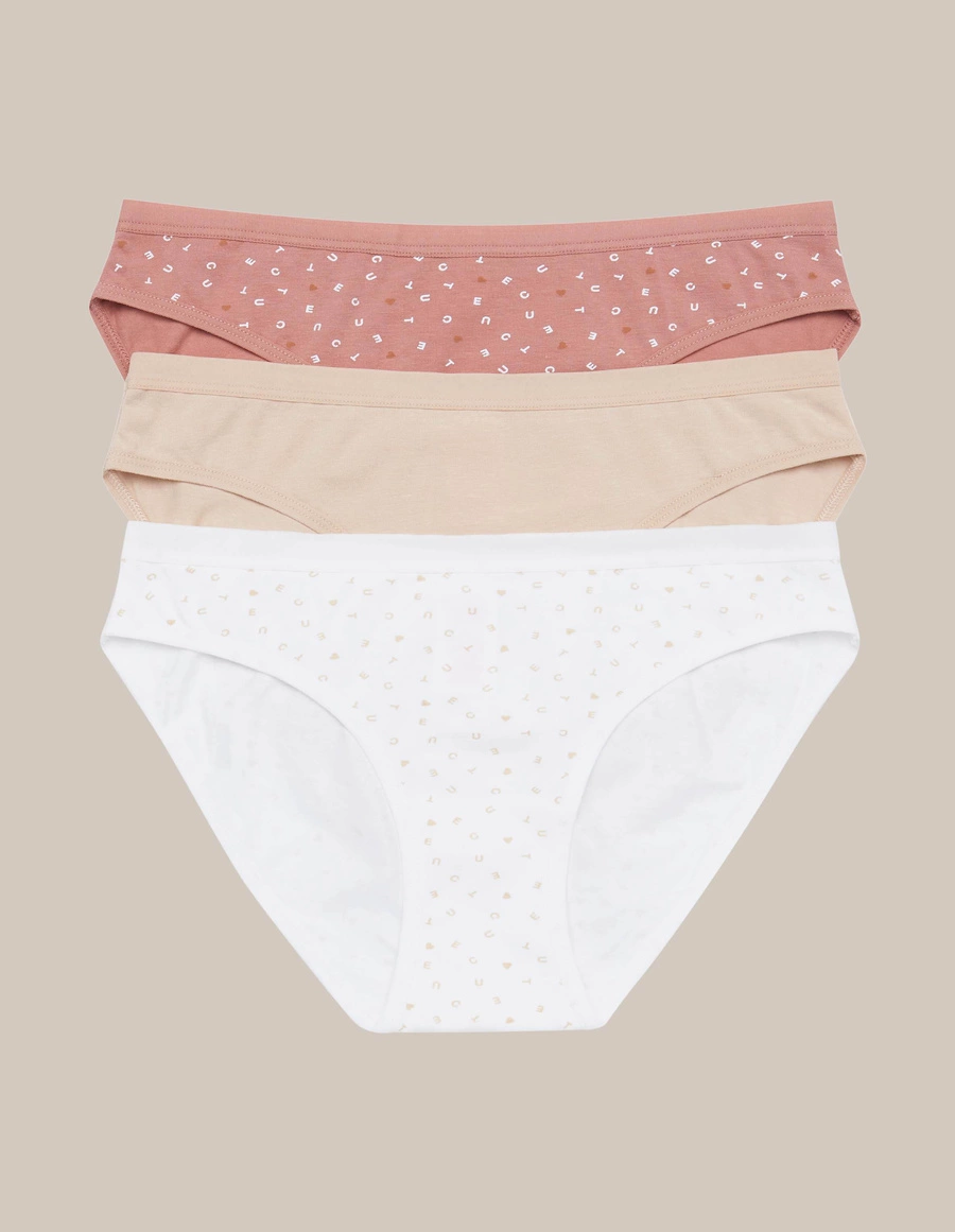 Oto klasyka sama w sobie – uniwersalne majtki Mi-Mi w trzypaku, uszyte z bawełnianej dzianiny. Dla codziennego komfortu łączą prosty krój typu bikini z miękkim, przewiewnym materiałem oraz nieuciskającą gumką w pasie. W zestawie znajdziesz 3 pary damskich fig: jednokolorowe oraz w niewielkie wzorki.