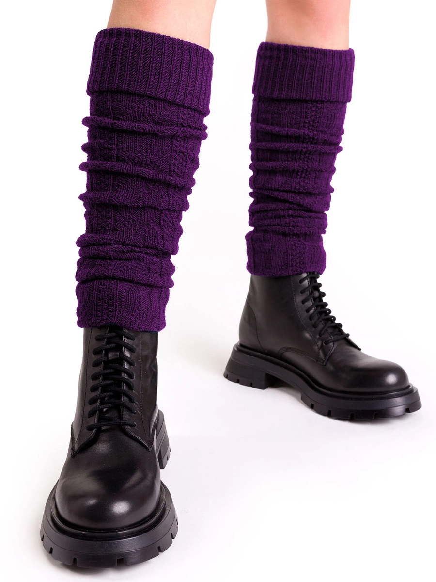Fioletowe getry wełniane damskie wygodne ocieplacze Warkocz Steven - idealne na sezon jesienno-zimowy
