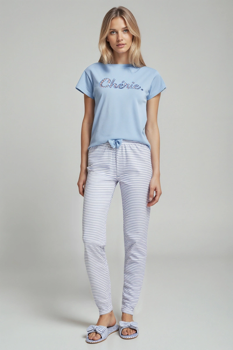 Górna część piżamy to różowa koszulka z krótkim rękawem, ozdobiona subtelnym ażurowym haftem i napisem, które dodają jej nowoczesnego charakteru. Dolna część to długie, białe spodnie w niebieskie paski, wyposażone w elastyczną talię z wiązaniem, co gwarantuje idealne dopasowanie do sylwetki. Ten zestaw to połączenie klasyki z nowoczesnością, które z pewnością przypadnie do gustu każdej kobiecie.