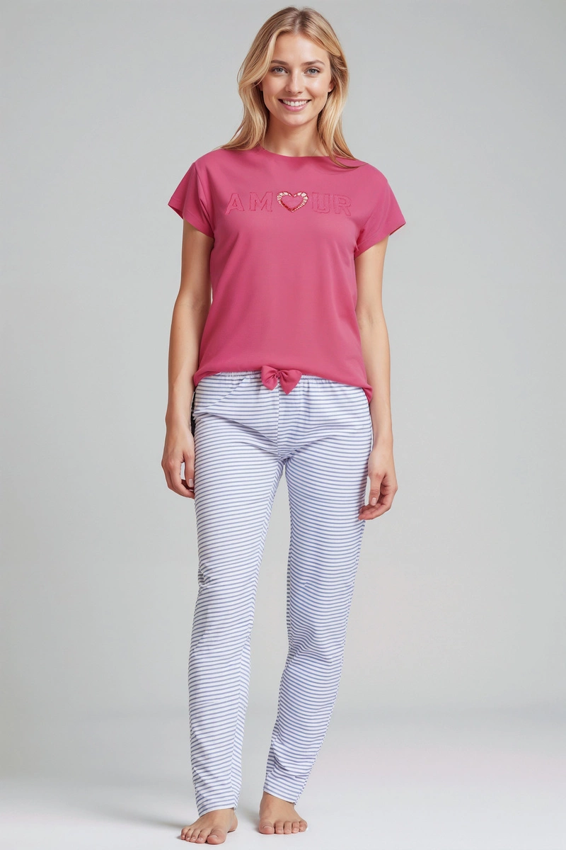 Górna część piżamy to urocza różowa koszulka z krótkim rękawem, która zachwyca ażurowym haftem i subtelnym napisem. To połączenie klasyki z nowoczesnym akcentem, które sprawia, że każda kobieta poczuje się wyjątkowo. Dolna część to długie spodnie w eleganckie niebieskie paski, które idealnie komponują się z koszulką, tworząc harmonijną całość. Elastyczna talia z wiązaniem zapewnia doskonałe dopasowanie i pełną swobodę ruchów.