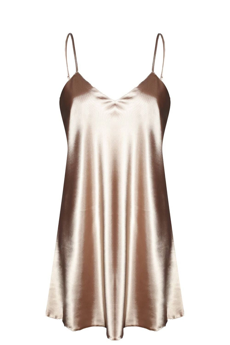 GŁADKA HALKA USZYTA ZE ZWIEWNEJ SATYNY.  PRZÓD HALKI TWORZY DELIKATNY TRÓJKĄTNY DEKOLT. RAMIĄCZKA SĄ CIENKIE I REGULOWANE.