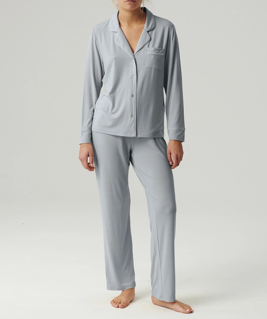 Piżama składa się z koszulowej góry z długimi rękawami i dekoltem w kształcie litery V, zapinanej na guziki, oraz długich spodni z prostymi nogawkami. Wykonana z lekkiego i delikatnie połyskującego modalu z dodatkiem elastanu, gwarantuje niezwykłą miękkość i przewiewność. Materiał ten jest nie tylko przyjemny w dotyku, ale również przyjazny dla ciała, co czyni go idealnym wyborem na ciepłe, letnie noce.