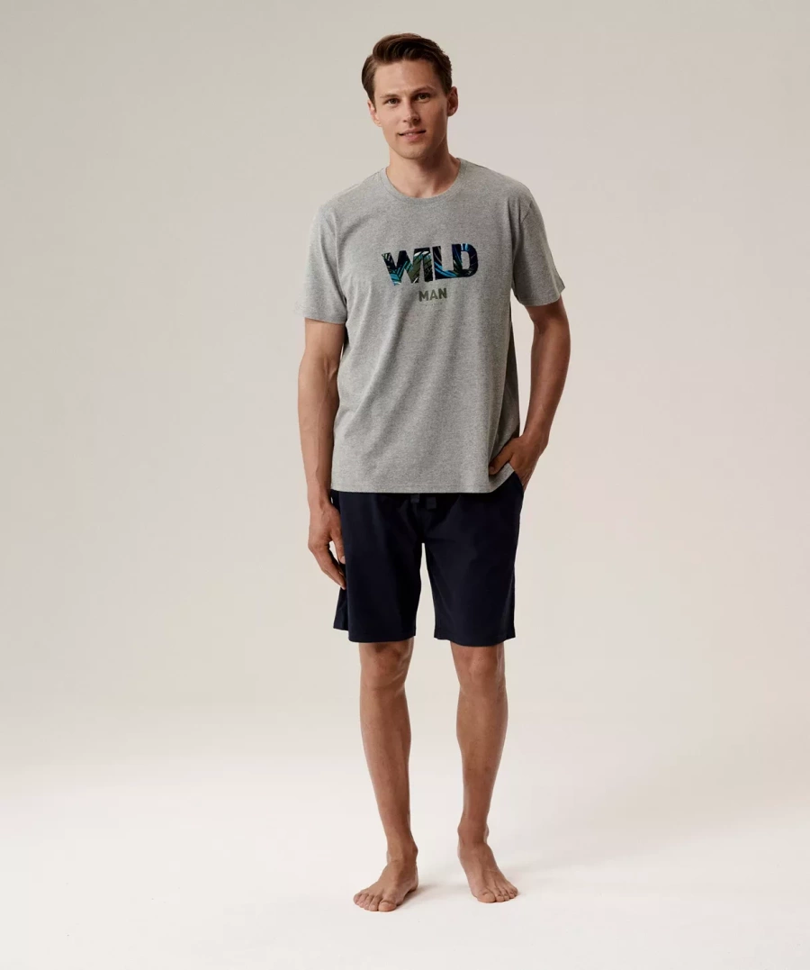 - Nowoczesny styl: Szary melanż z napisem „WILD” i granatowe szorty