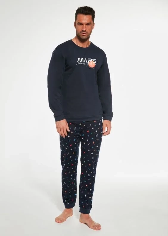Niezwykle wygodna piżama z długim rękawem i długimi spodniami, tworzy idealne zestawienie na jesień i zimę. jest to komfortowa piżama męska ze ściągaczem. Piżama utrzymana w modnej, męskiej kolorystyce. Góra piżamy z ekstrawaganckim nadrukiem. Spodnie kolorystycznie nawiązują do góry piżamy. Komplet piżamowy jest bardzo miły w dotyku. Piżama męska wykonana z naturalnej dzianiny, która pozwala skórze oddychać. Piżama idealna na prezent.