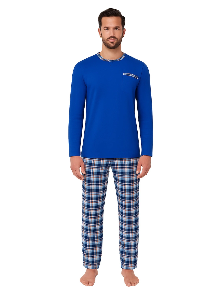 Piżama beMen to synonim wysokiej jakości. Wykonana z 100% oddychającej bawełny, gwarantuje przewiewność i komfort podczas każdej nocy. Góra piżamy z długim rękawem, okrągłym dekoltem i subtelną kieszonką, wykończona elegancką lamówką, harmonijnie współgra z modnymi, luźnymi spodniami w kratkę. Szeroka guma w pasie, regulowana dodatkowo sznureczkiem, oraz praktyczny rozporek na guziki i boczne kieszenie, czynią tę piżamę niezwykle funkcjonalną.