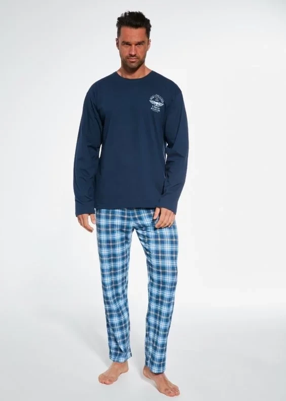 Nowoczesny design i praktyczne rozwiązania sprawiają, że piżama ta jest nie tylko komfortowa, ale i stylowa. Gładka, jeansowa góra z eleganckim nadrukiem na piersi oraz modne spodnie w kratę dodają zestawowi wyjątkowego charakteru. Luźny krój zapewnia pełną swobodę ruchów, a długie rękawy i spodnie dbają o komfort cieplny podczas chłodnych nocy. Eleganckie wykończenie dekoltu plisą dodaje piżamie klasy, co czyni ją idealnym wyborem dla mężczyzn w każdym wieku.