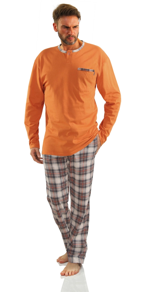 Klasyczny krój piżamy, z długim rękawem i okrągłym dekoltem, wzbogacony jest o modne wzornictwo w postaci długich spodni w elegancką kratkę. Szeroka guma w pasie, ściągana dodatkowo sznureczkiem, oraz boczne kieszenie i rozporek na guziki, to detale, które zwiększają praktyczność i komfort użytkowania. Całość wykończona jest elegancką lamówką, która dodaje piżamie klasy i stylu.