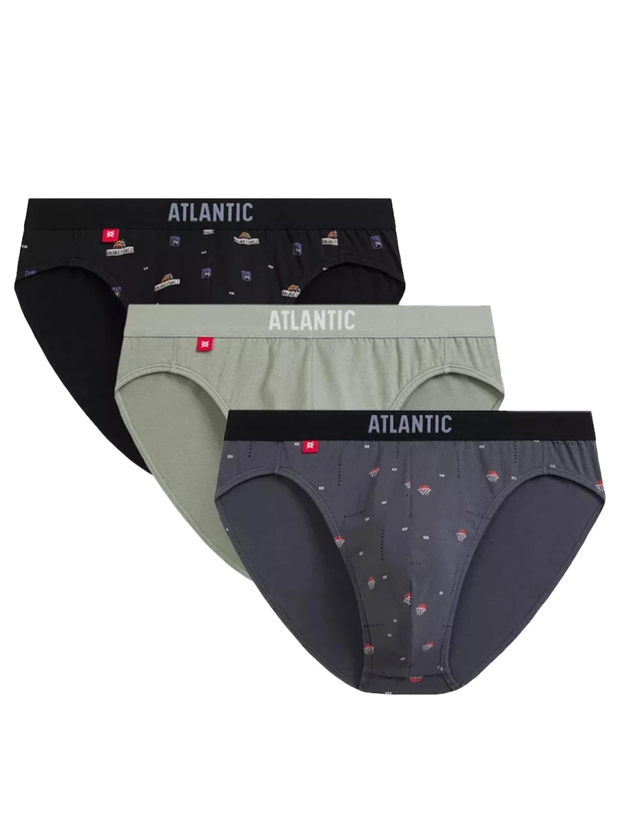 Slipy Atlantic wyróżniają się sportowym krojem i unikalnym koszykarskim nadrukiem, który doda energii każdemu dniu. W zestawie znajdziesz trzy wersje kolorystyczne: klasyczne czarne i grafitowe z motywem koszykarskim oraz gładkie, jasno-zielone. Dzięki niskiemu stanowi i miękkiej gumie wykończonej logo Atlantic, slipy doskonale przylegają do ciała, nie uciskając go.