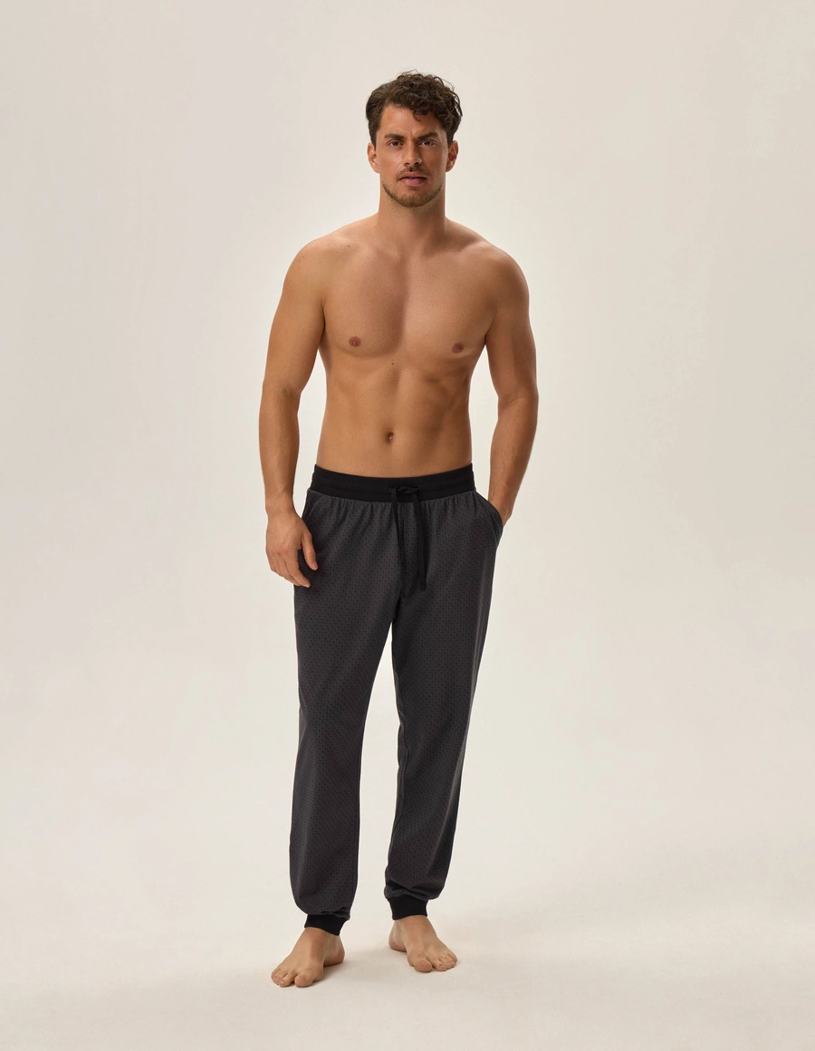 Luźne, przewiewne i w 100% z bawełny – właśnie takie są spodnie Harper, które zapewniają pełną swobodę podczas domowego odpoczynku. Dzięki sznurkom w pasie łatwiej dopasować je do sylwetki. Nieuciskające ściągacze w kostkach trzymają z kolei nogawki na miejscu. Dodatkowo te męskie spodnie wyróżniają się geometrycznym printem z literą H.