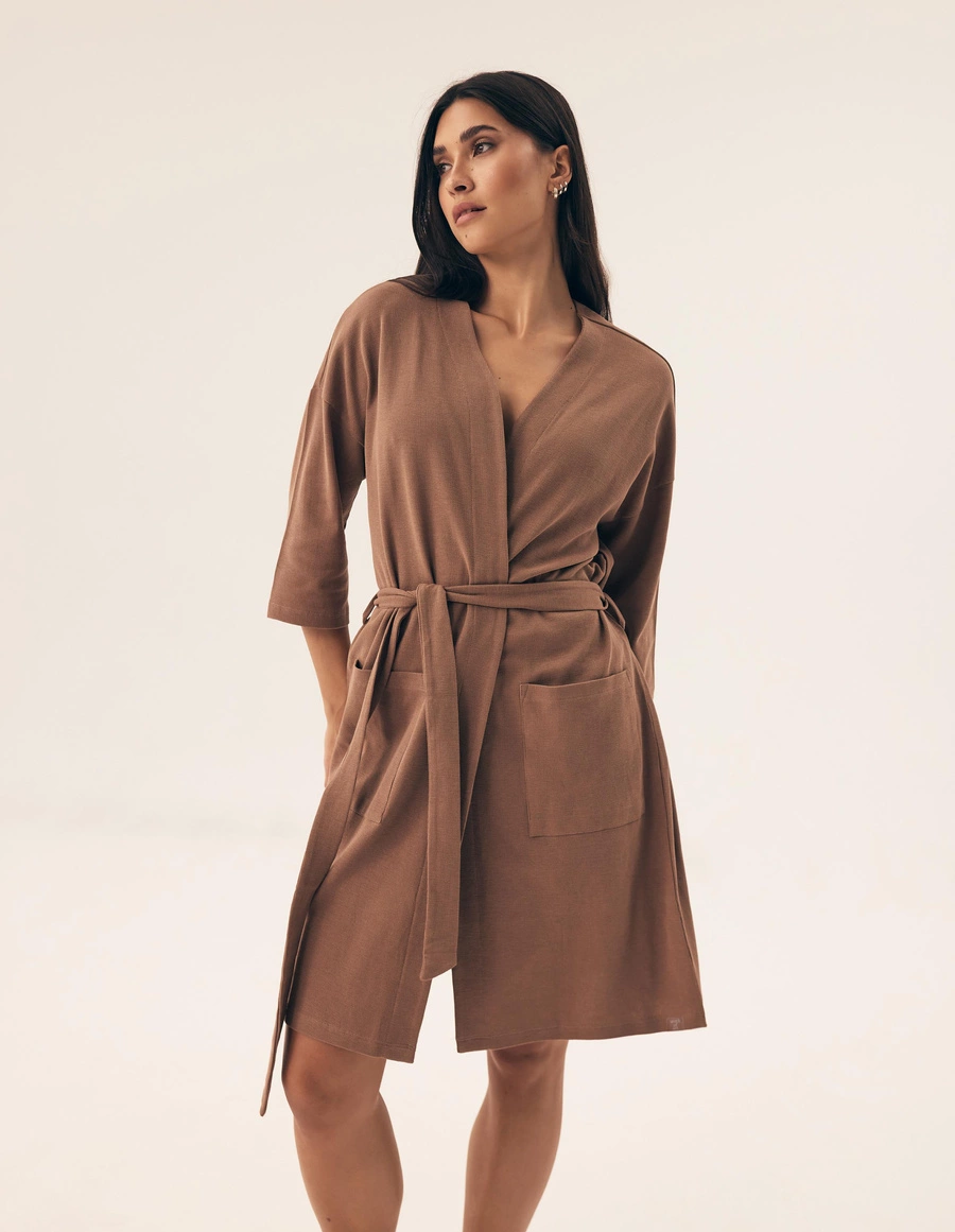 Projekt szlafroka 42779 w kolorze coffee prezentuje elegancki, uniwersalny styl, który pasuje do każdej kobiety. Materiał, z którego jest wykonany, łączy 100% bawełnę oraz 88% bawełny z 12% poliestru, co zapewnia zarówno przewiewność, jak i trwałość. Każdy detal, od koloru po starannie wykończone szwy, jest zaprojektowany z myślą o najwyższym komforcie użytkowania.